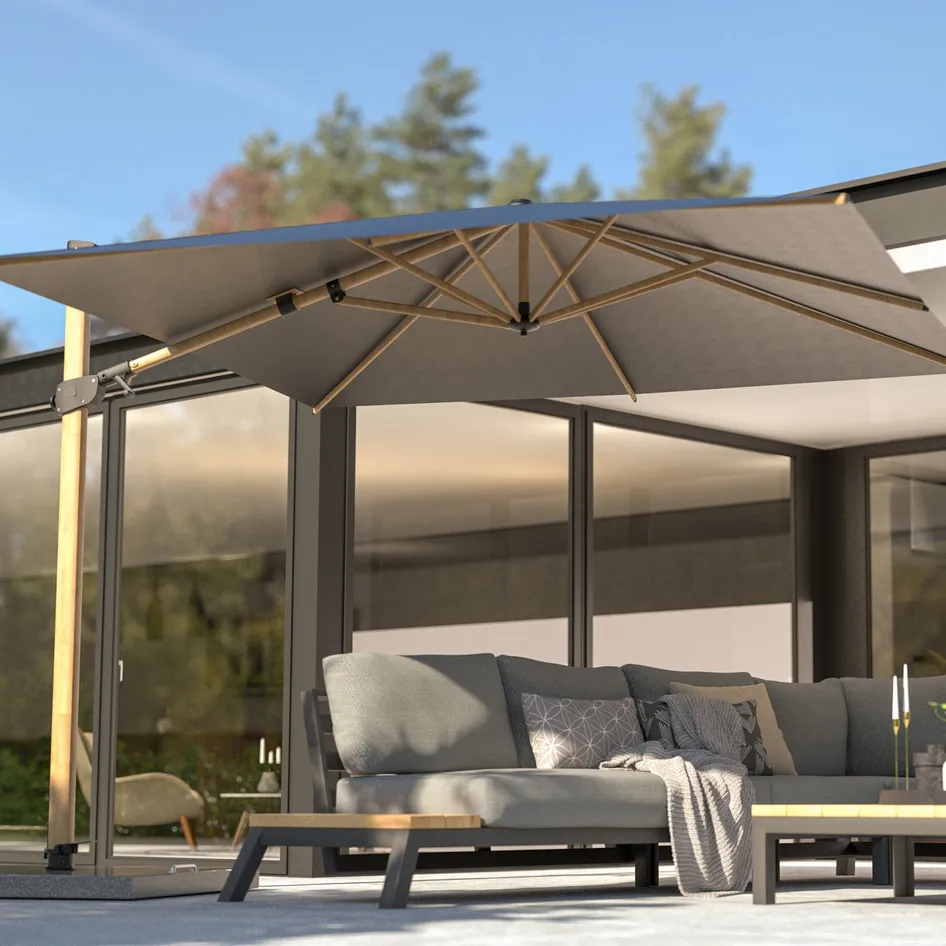 Ook als je parasol niet wordt gebruikt, staat deze vaak wel gewoon op je terras. Het is daarom goed om over de kwaliteit na te denken. Wij gebruiken materialen van hoogwaardige kwaliteit, zoals ge-poedercoat aluminium voor de frames en olefin of polyester voor de parasoldoeken.